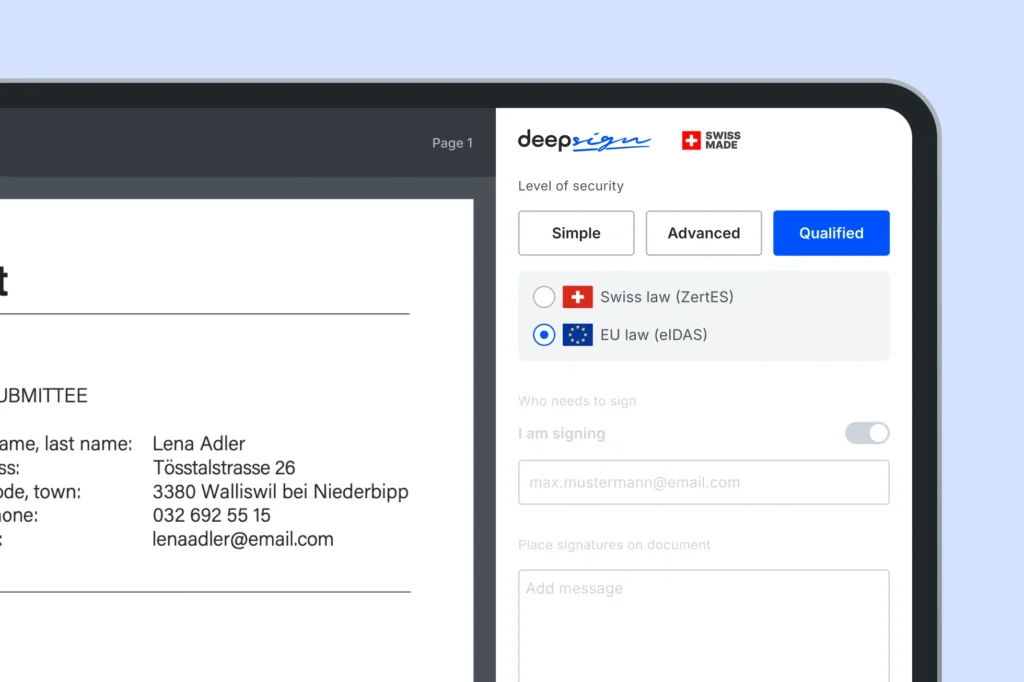 At the highest level is the qualified electronic signature. It is based on digital certificates issued by recognised providers and requires strict identity verification, for example via apps like DeepID or Mobile ID. In Switzerland, this type of signature is legally equivalent to a handwritten one.